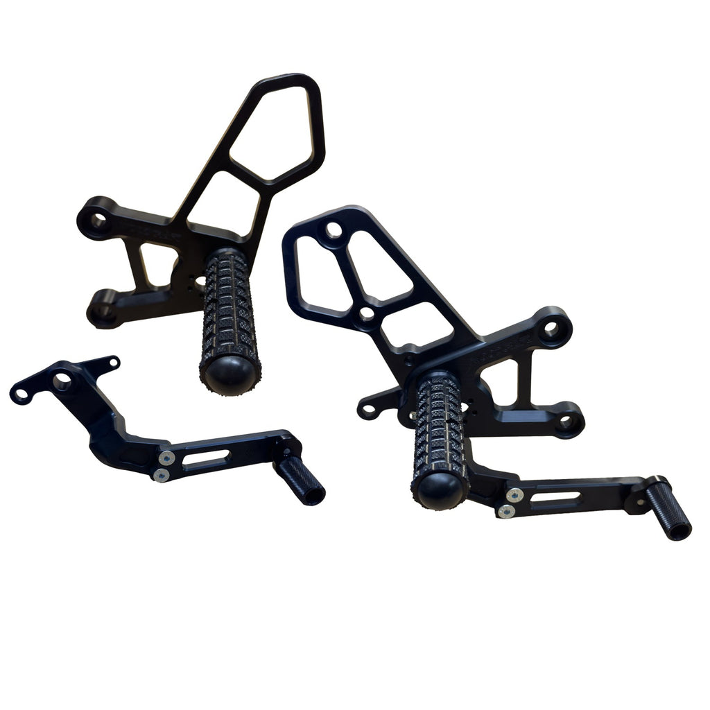 • Woodcraft rearset kits offer eccentric foot and toe pegs for adjustability (where applicable).