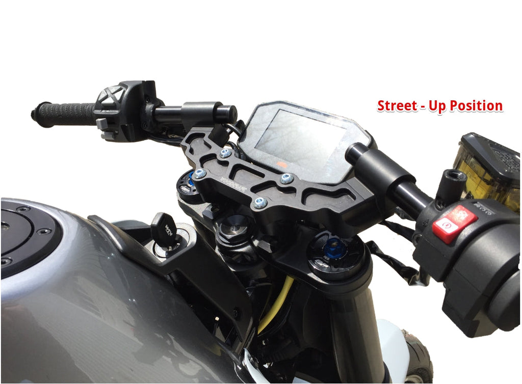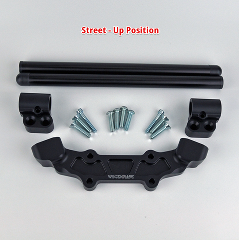 The Street setup runs the riser in the "Up" position. This will accommodate the headlight and turn signals.