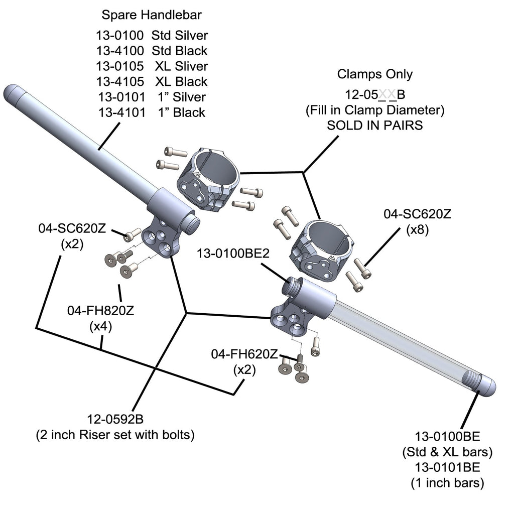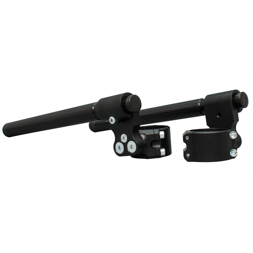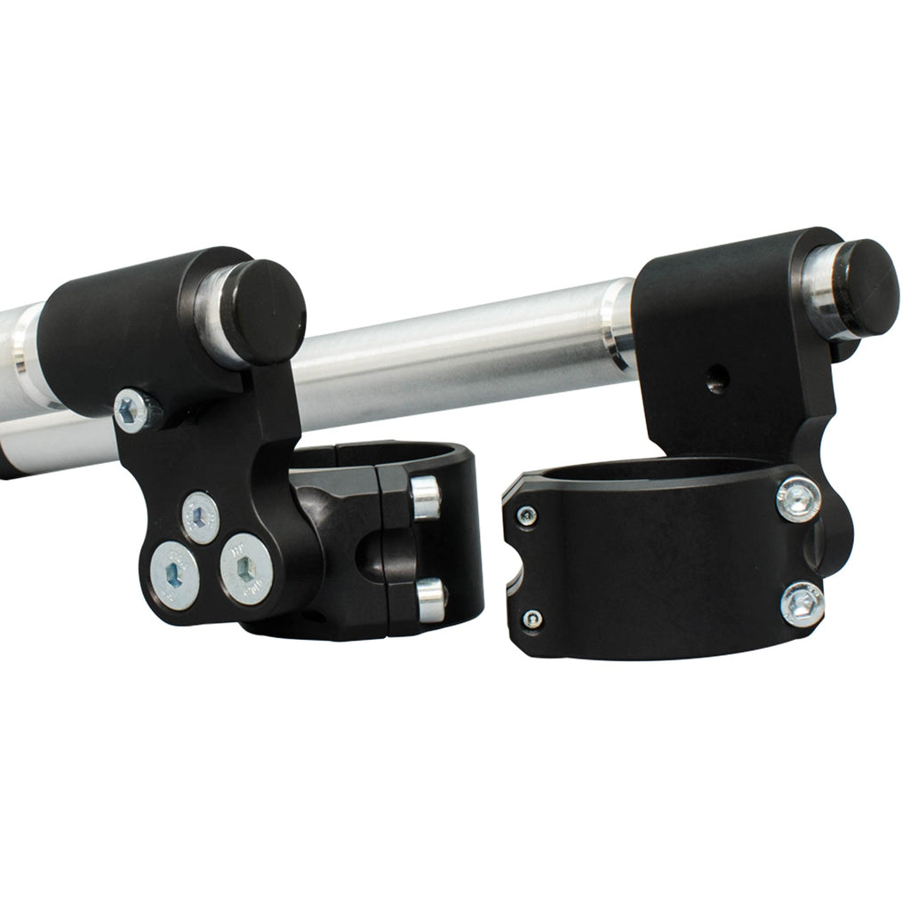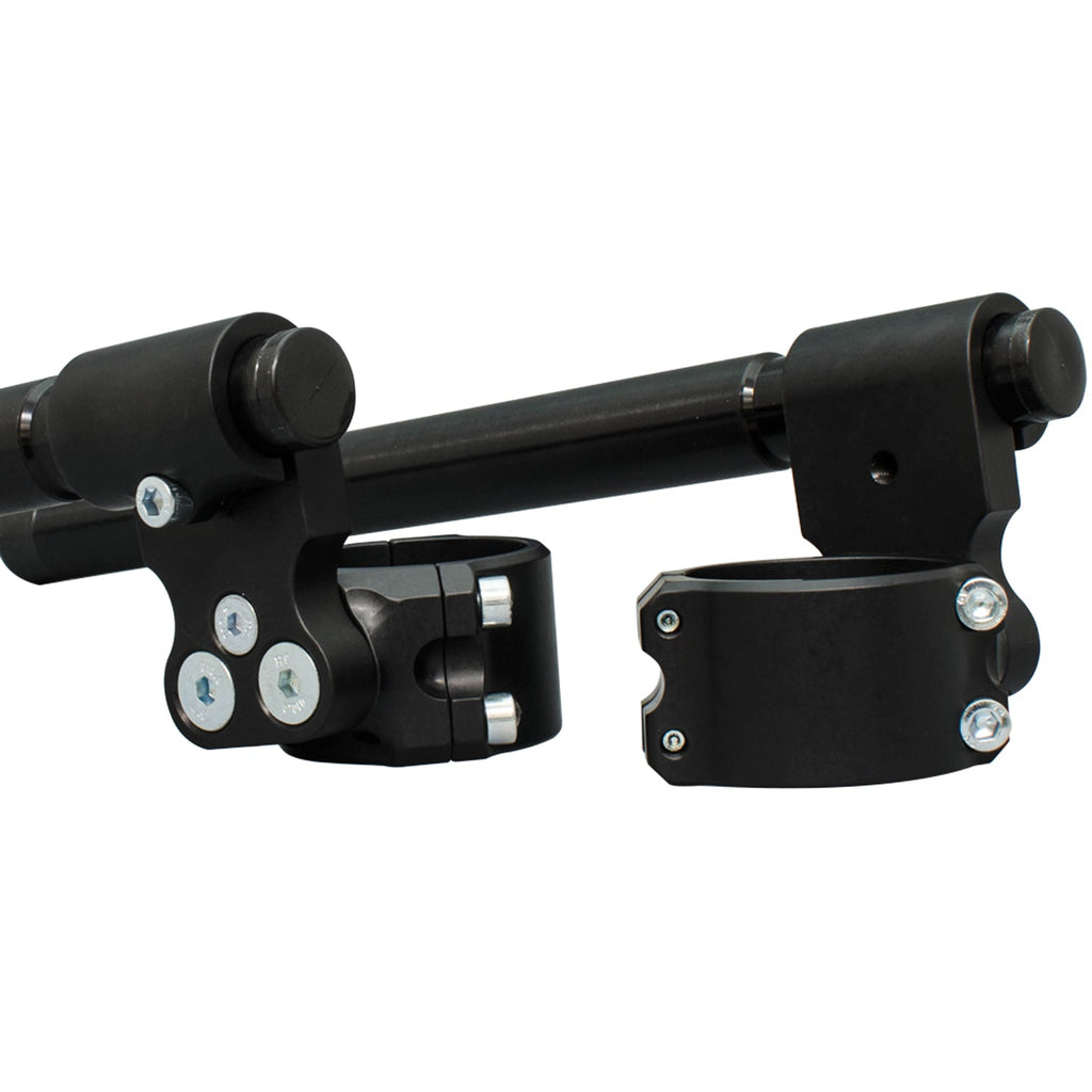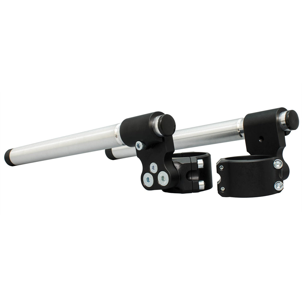Woodcraft 3-piece split clipon risers are specially designed to make installation and removal a snap. Our 3-piece design is race proven and makes it easy to service your clipons below the triple clamp without having to disassemble the entire front end. Special attention has also been taken to save weight wherever possible on these clamps. The bars themselves are 12 inches long and are easily adjusted to whatever custom width you desire. Racers no longer have to worry about replacing an expensive complete clipon assembly after a crash - these risers use an inexpensive universal handlebar.